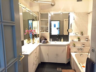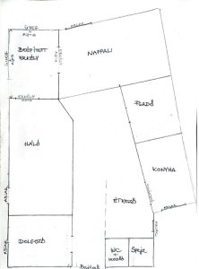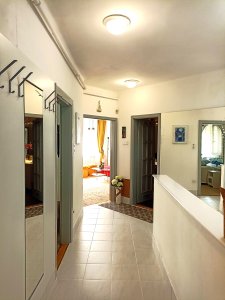 Innen közelíthető meg a 3 külön nyíló szoba, a kamra, valamint a káddal és zuhanyfülkével ellátott fürdőszoba, és a külön helyiségben lévő WC.