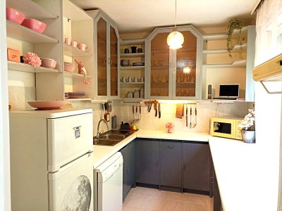 A lakásba lépve egy tágas, világos folyosón haladhatunk tovább az egy légtérben lévő étkezőbe és konyhába.
