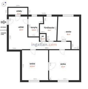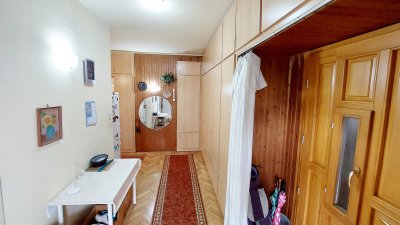Szobák: 3 nagy méretű, nagy ablakos szoba, 2 utcára, 1 a kertre néz. Kádas fürdő WC-vel, egy másik wc külön helységben. Nagy ablakos konyha. Tágas előtér, amely étkező-nappalivá is alakítható. Az előtérben hatalmas beépített szekrények.