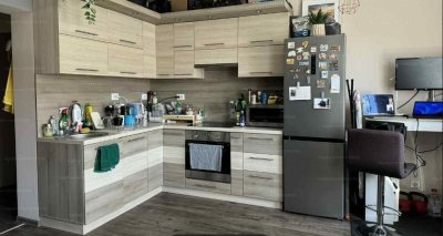 A 20 m2-es amerikai konyhás nappali az utcára néz. Beépített konyhabútorral felszerelt, elfér mellette akár 4 személyre étkező asztal székekkel. A nappali klímával felszerelt, jól pakolható, tágas.