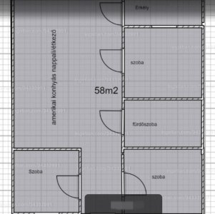 A lakás 58 nm-én kapott helyet a konyha, étkező és a nappali egyben, + 3 félszoba, fürdőszoba és erkély.