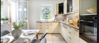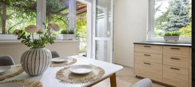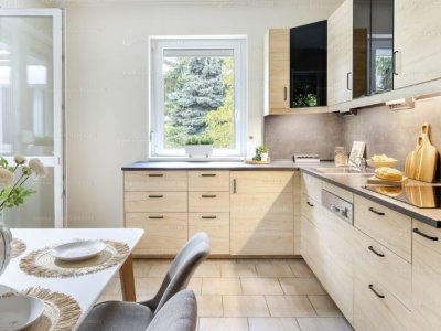A modern konyha (2020) és étkező indukciós főzőlappal és beépített sütővel felszerelt, külön hellyel egy akár 100 cm széles, az egész családot kiszolgáló hűtőszekrénynek.