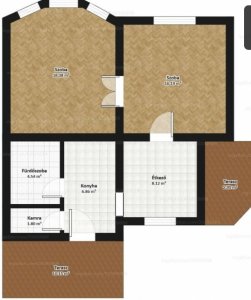 A ház belül körbejárható, a konyhából balra nyílik egy kisebb kamra – onnan érhető el a padlás is –, egy fürdő, jobbra pedig egy étkező helyiség. Az étkezőn keresztül jutunk az egyik szobába, amelyet duplaszárnyú ajtó köt össze a másik szobával, ahonnan ugyancsak kis ajtó nyílik a fürdőbe.