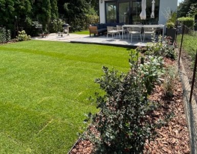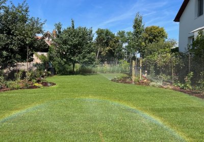 A kertben található gyümölcsfa, díszfák, dísznövények és gyep öntözése WiFi-s, intelligens (víztakarékos) Hunter öntözőrendszerrel történik (4 öntöző kör, 1 csepegtető kör). A kerti csap és az öntözőrendszer vízfogyasztását külön locsolómérő méri. A gyep nyírásáról programozható Gardena robotfűnyíró gondoskodik.