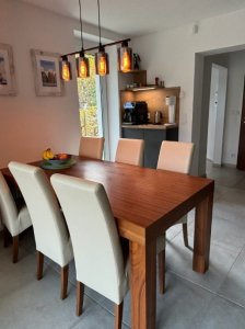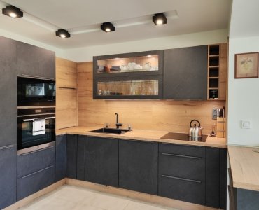 A konyha modern és gépesített: AEG és Electrolux beépített hűtő, sütő, mikró, mosogatógép, indukciós főzőlap és automatikusan vezérelt szagelszívó, Blanco mosogató tálca és csaptelep került beépítésre.