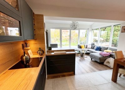 A konyha egyedi tervezésű, a szobákban és az előszobában beépített szekrények találhatók. A hasznosítható ficakoknak, az izgalmasan eltolt tereknek köszönhetően a ház igazán egyedi hangulatú, nagyon élhető, és a teraszoknak és színes növényekkel beültetett kertnek köszönhetően napfényes, tágas – egy igazi ékszerdoboz a kertvárosban.