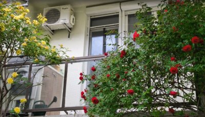 A lakáshoz tartozik a kb. 3,5 nm-es erkély, aminek külső falán 3 cm vastag xps szigetelés van. Az erkélyen van egy tároló szekrény építve 5 cm-es ytong téglából, ami praktikus kertészeti és kültéri eszközök tárolására. Az erkély előtti kis kertben igény szerint a kertészkedni vágyók kiélhetik magukat, de a fűnyírásról a lakásszövetkezet kertésze gondoskodik. Az erkély két lábánál futórózsák futnak fel egészen az erkély szintjéig. Ezek tavasszal gyönyörűen virágoznak és védenek az esetleges betolakodóktól.