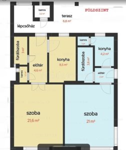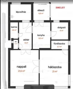 - emelet (80 m2): 2 szoba, 1 fél szoba, konyha, étkező (beépített terasz), előszoba, kamra, fürdőszoba, wc