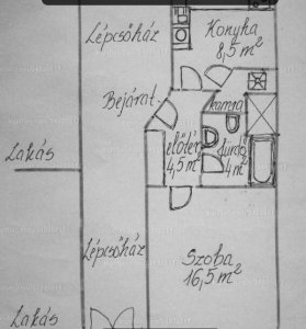 A lakás helyiségei: előszoba, konyha, kamra, fürdőszoba és egy szoba. A szoba az előkertre, míg a konyha a hátsó udvarra néz.