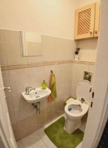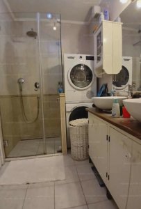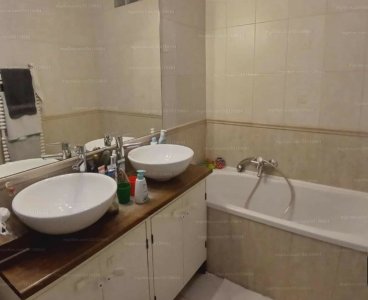 •Épített zuhanykabin + fürdőkád, dupla mosdókagyló beépített szekrényekkel